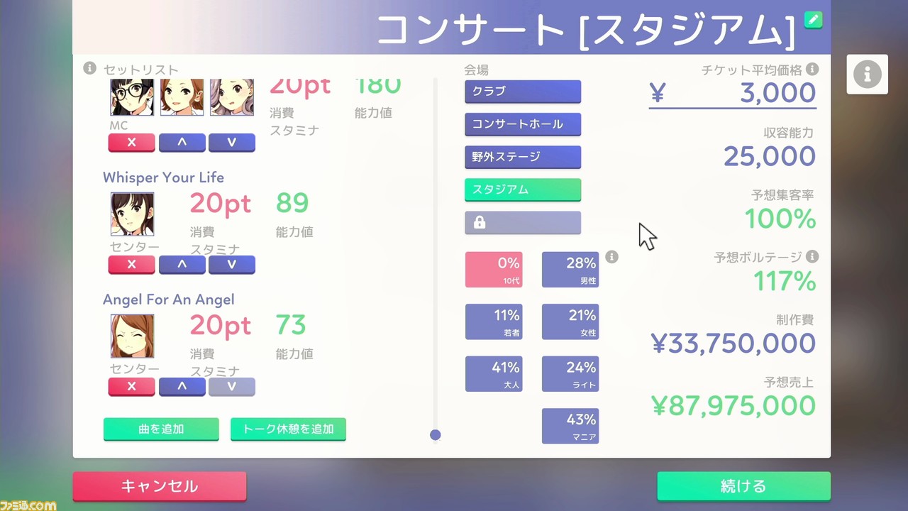 作詞作曲編曲振付、そしてどの子をセンターに据えるか、何人組で歌うのか。プレイヤー自身が楽曲をプロデュースし、CDを制作してリリースしましょう。もちろん、コストを掛け過ぎて赤字にならないように気をつけましょう。