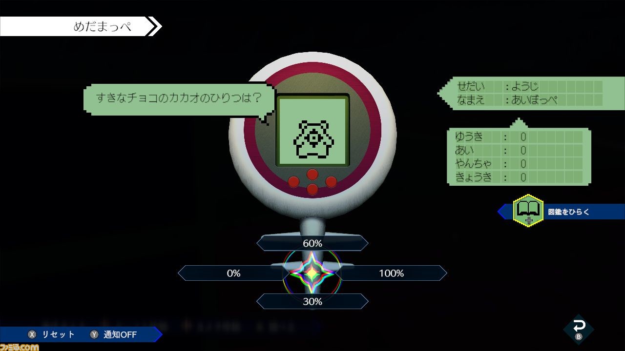 質問に答えて、謎の生物(?)“めだまっぺ”を育てていくミニゲーム。好奇心旺盛なめだまっぺは20分おきに質問をしてくるので、4つの回答の中からひとつを選ぼう。回答次第で、めだまっぺは異なる姿へと成長していく。