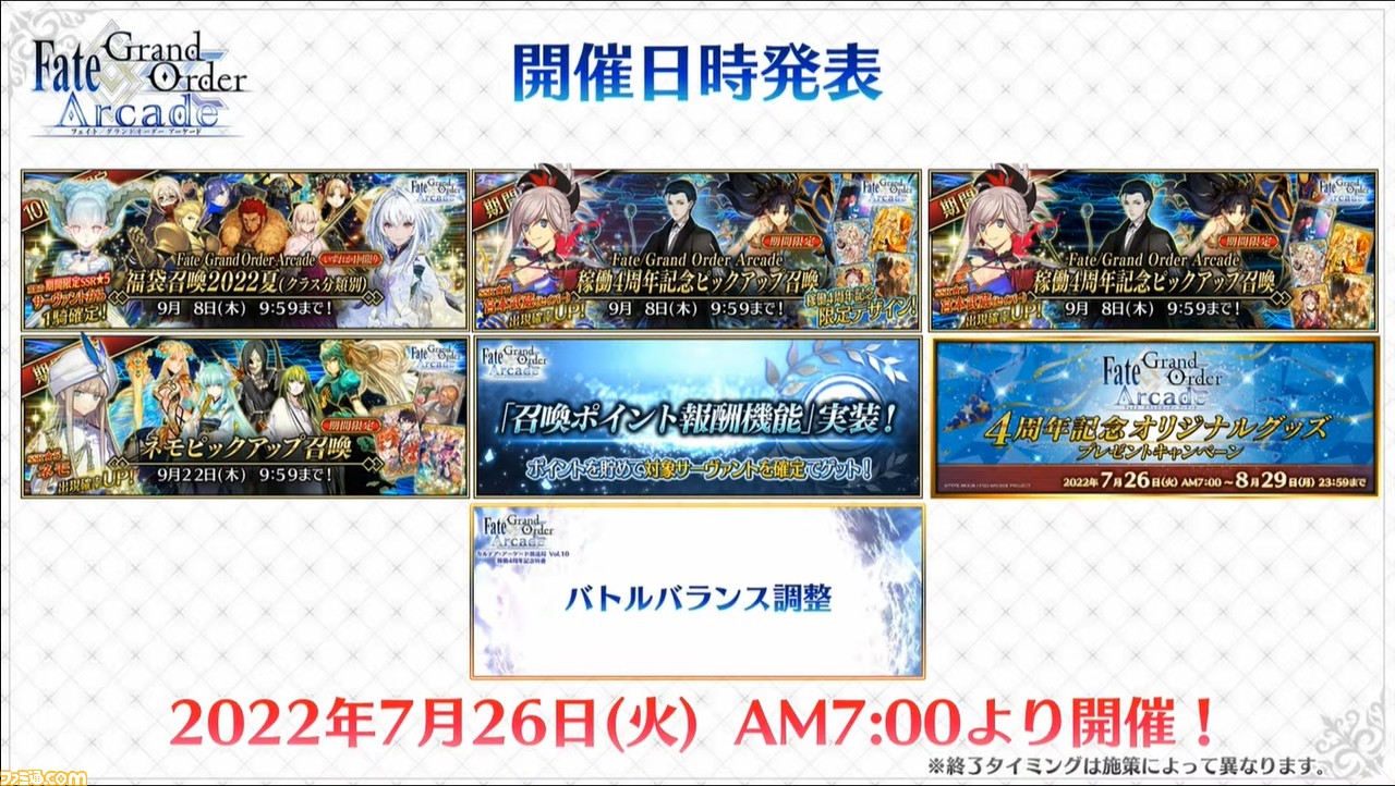 『Fate/Grand Order Arcade』(以下、FGO Arcade)にて2022年7月24日に配信された公式生放送“Fate/Grand Order Arcade カルデア・アーケード放送局 Vol.10 稼働4周年記念特番”で発表されたゲーム最新情報をまとめてお届けする。