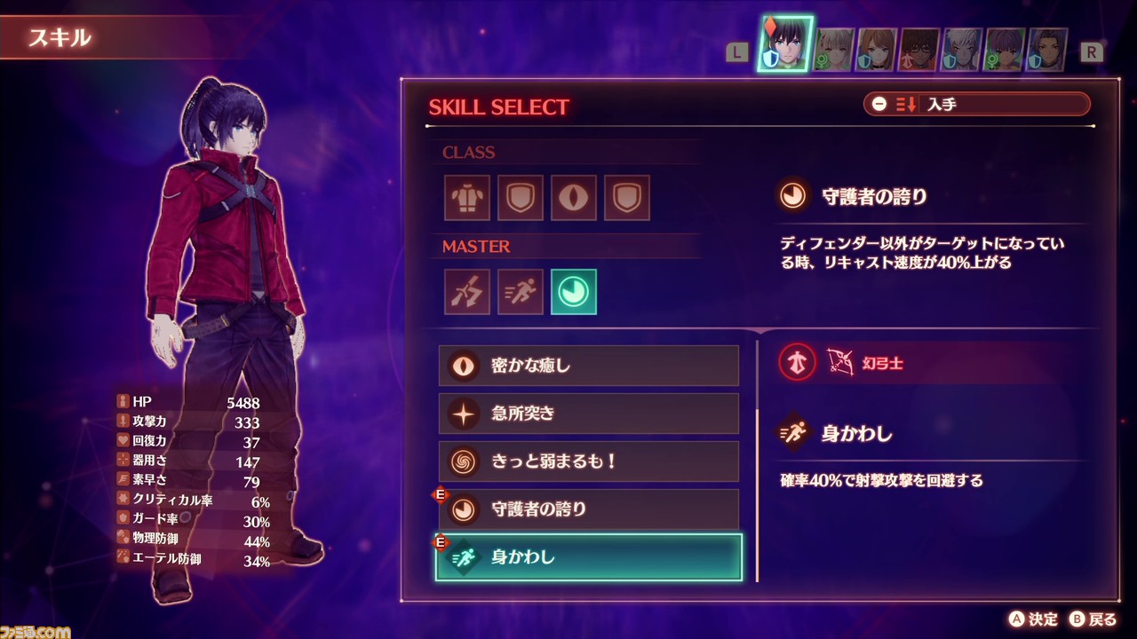 - ディフェンダー:物理防御、エーテル防御、ガード率、回避率、最大HP