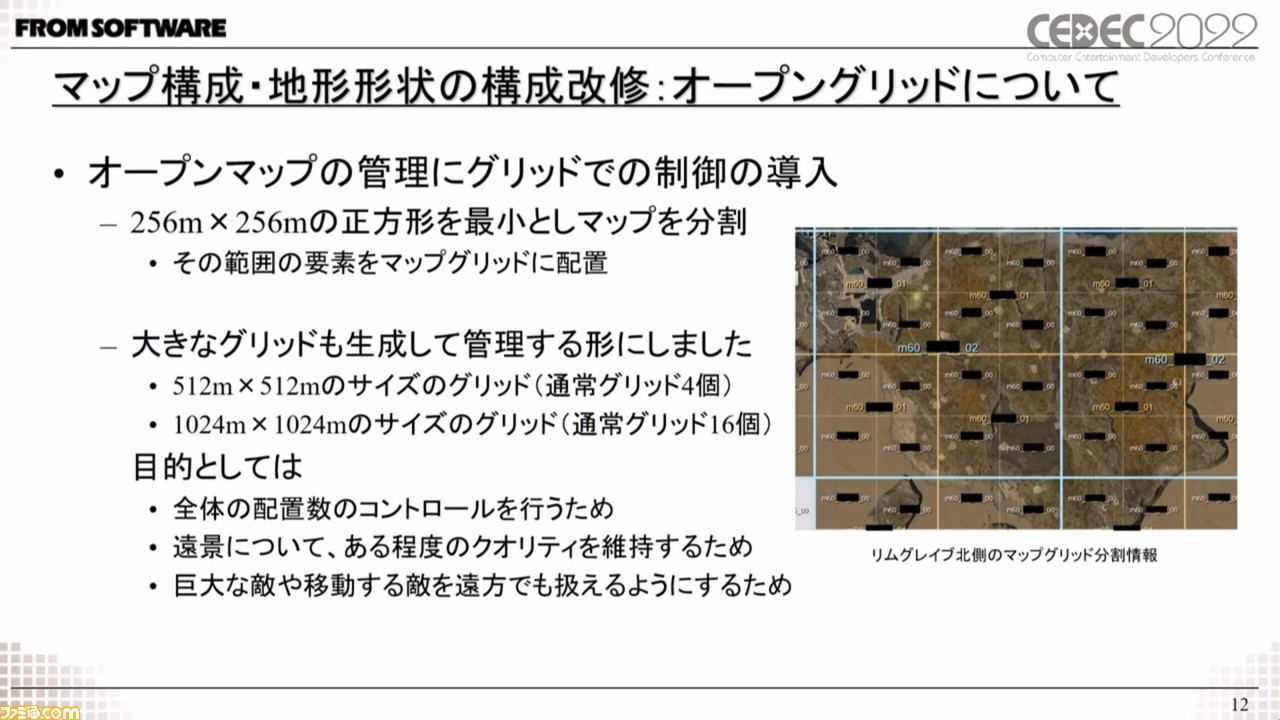 そのためマップを細かいマス目のエリアで分けて、マス目の周囲のエリアをロードする仕組みにしたという。すべてのエリアが同じ範囲になっているのではなく、巨大なボスとの戦いや高速移動が必要となる場所ではエリアの範囲を大きくして対処したそうだ。