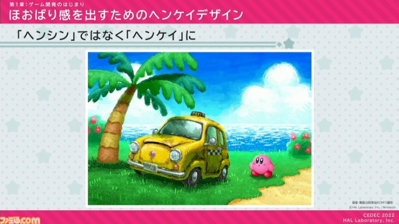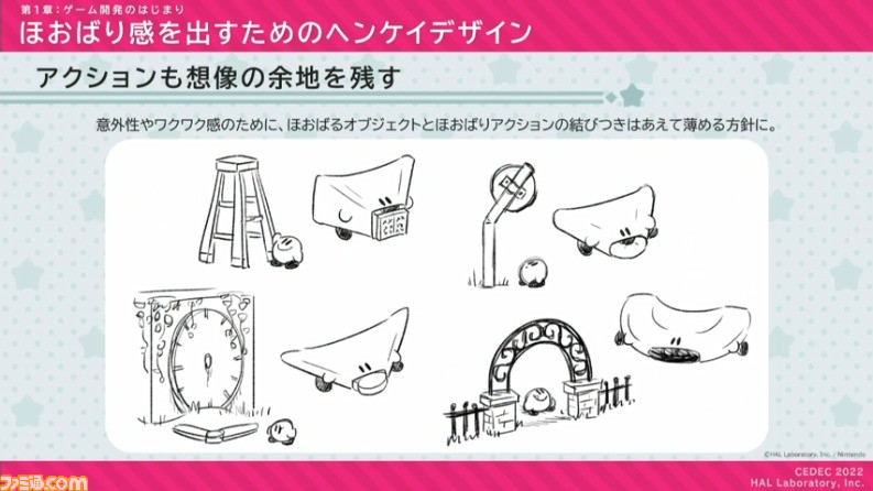 可愛く愛される姿にはしたかったが、同時に「あのまん丸なカービィがこんな姿に!?」というインパクトも与えたかった。それゆえ最終的には、10人中に10人がかわいいとは思わなくても、10人中7人はかわいいと思えるような“ほおばりヘンケイ”のデザインを目指したそうだ。