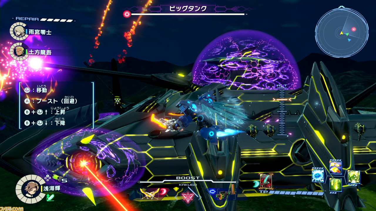 「ビッグタンク」を撃破するためには、新要素となる「空中移動」が重要です。自由自在に移動して攻撃をかわしたり、空中で狙いを定め射撃攻撃をしたりして撃破を目指しましょう!