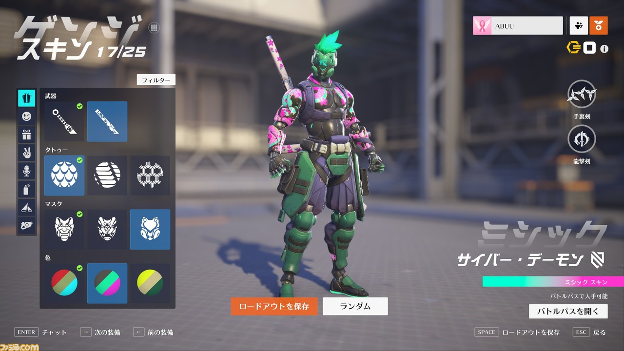 そして、バトルパス報酬の目玉といえば、カスタマイズ可能な新レアリティのミシック・スキンだろう。なんと、今回手に入れられる、ゲンジのミシック・スキン“サイバー・デーモン”は、武器・タトゥー・マスク・色をそれぞれ組み合わせて変更可能となっている。