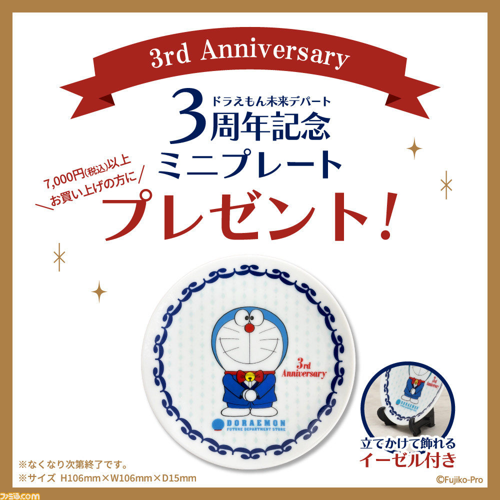 - 内容:「ドラえもん未来デパート3周年記念ミニプレート」(非売品)をプレゼント