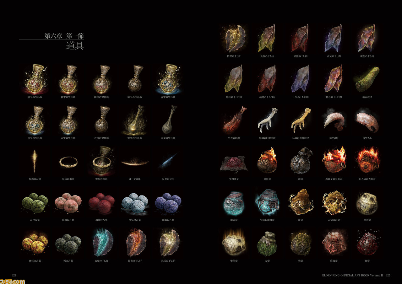 Volume IIでは、プレイヤーの前に立ちふさがる脅威であるエネミー、さまざまな武器のアートを掲載するほか、巻末にはゲームに実装されているアイテムイラストを多数収録しています。