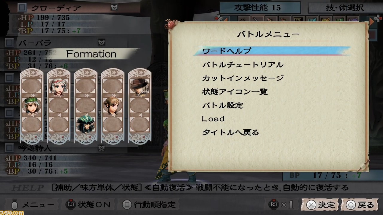 上野氏がバトル中にポーズボタンを押すことで、フォーメーションを確認できるという前振りを行ったところ、真デスが全体攻撃の“開門”を使用。攻撃をくらったあとにフォーメーションを確認してみると、なんど隊列がバラバラに変更されていた。