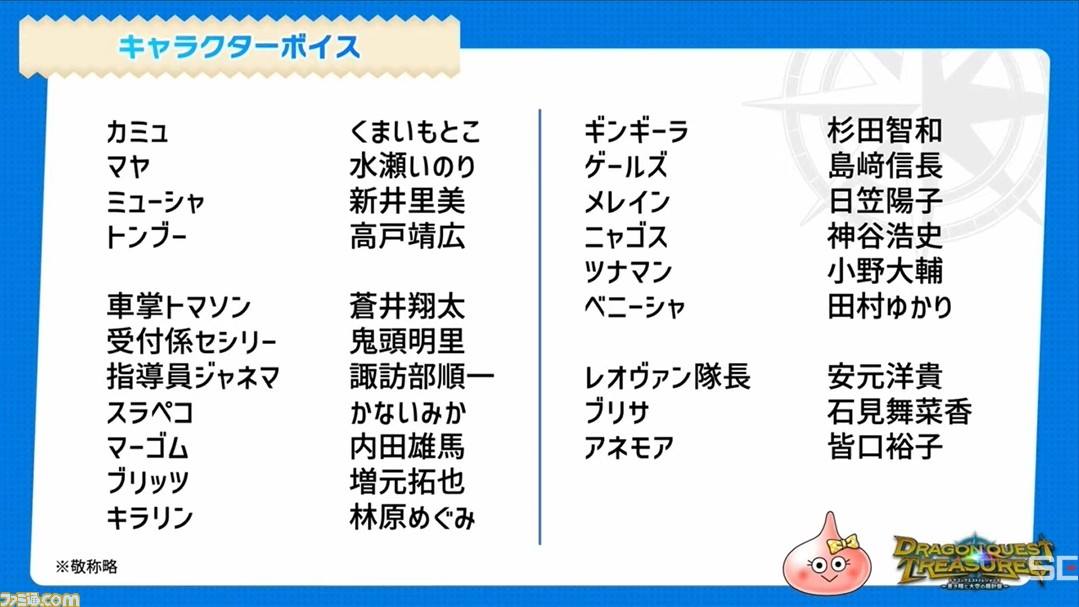 中でも注目なのは、モンスターボイスを担当した声優陣の豪華さ。冒険中に仲間モンスターが声を発しながらいっしょに行動してくれるのだが、そのボイスを担当した声優は以下の通り。