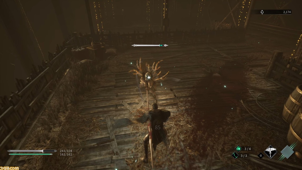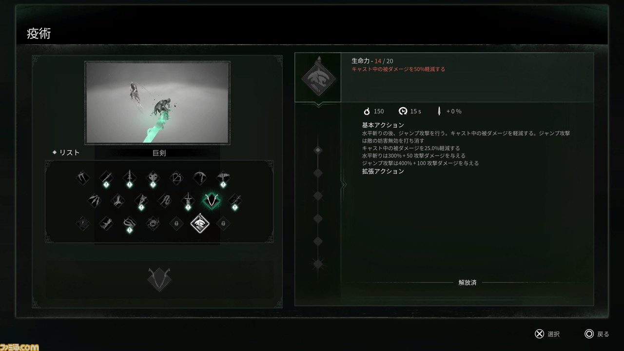 紹介した剣、爪、羽の3つが基本アクションになるのだが、そのほかにも疫術という魔法のようなアクションも使用できる。疫術はややユニークな要素として、朦朧状態の敵から奪うことも可能だ。爪攻撃を長押しすると溜めは長いのだが、敵から疫術を奪うアクションをくり出せるので、周囲にほかの敵がいない場合は積極的に奪ったほうがお得。