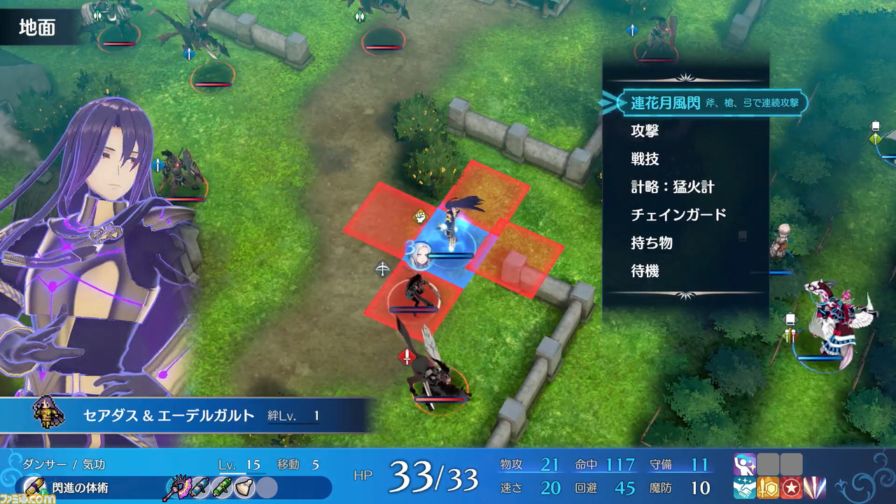 紋章士エーデルガルト/ディミトリ/クロードのエンゲージ技“連花月風閃”は、斧のアイムール、槍のアラドヴァル、弓のフェイルノートでの三連続攻撃を行う。