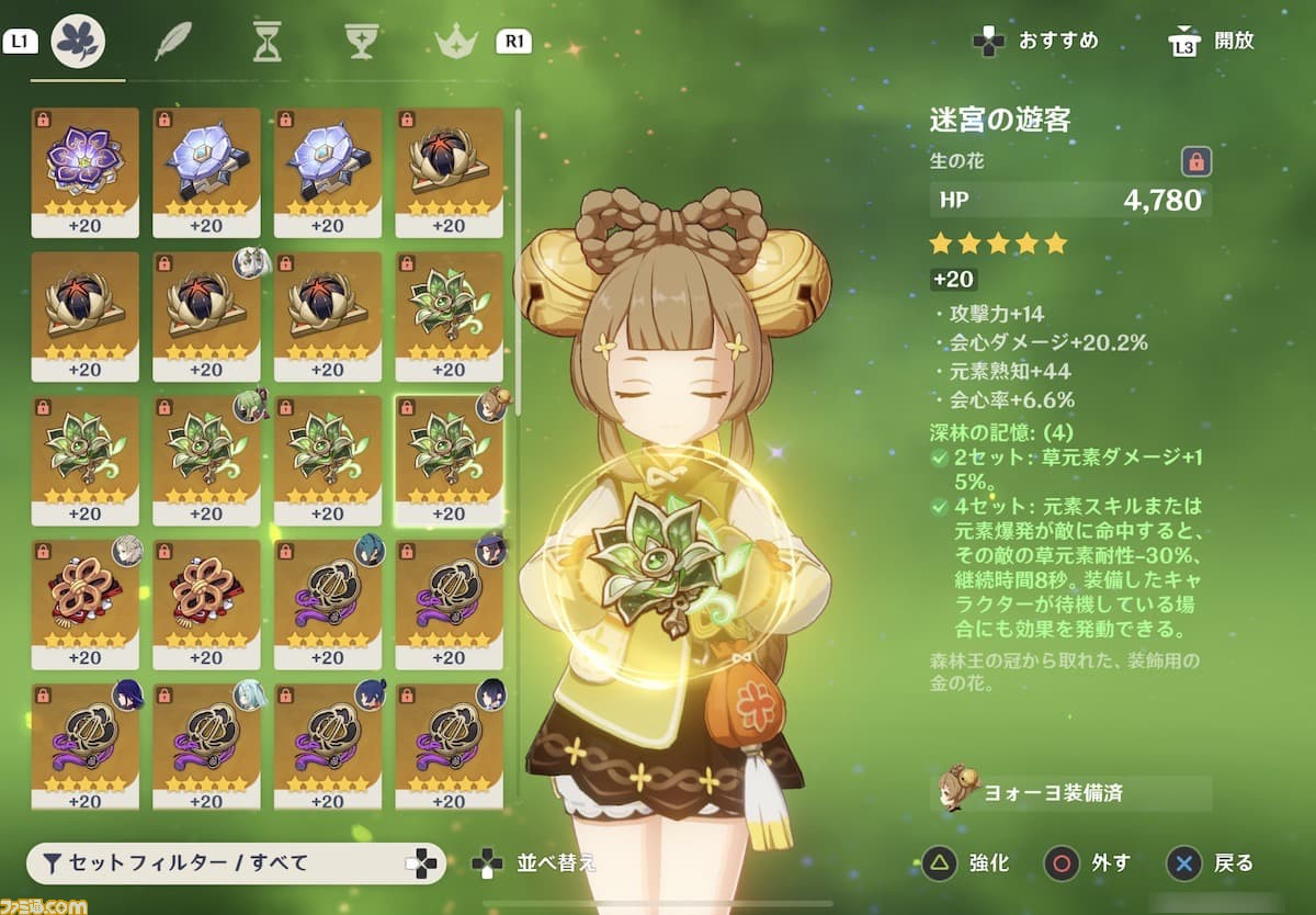ヨォーヨを運用する際に筆者がおすすめしたい聖遺物セットはふたつ。まずは草元素ならこれをつけておけば間違いなしの深林の記憶。2セット効果の草元素ダメージ15%アップは嬉しいですが、基本的に4セット効果である草耐性を30%下げてくれる効果がメインなので、深林の記憶を装備させるときは必ず4つ装備させましょう。特に激化や開花を主力とする編成ならこの聖遺物がダントツで強力ですね。