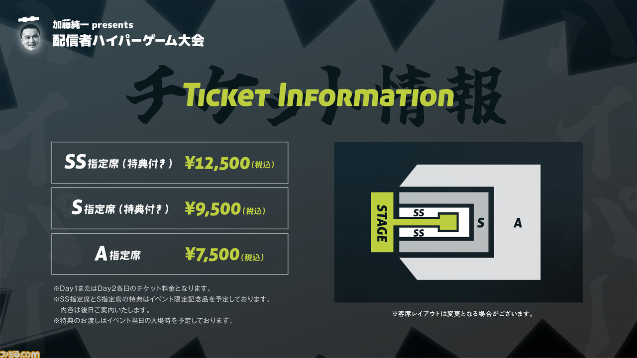 2023年3月25日(土)、26日(日)に幕張メッセにて開催予定のオフラインイベント“加藤純一presents 配信者ハイパーゲーム大会”について、公式サイトにてチケット情報が公開。チケットの種類や価格、申し込み情報などが明らかになった。