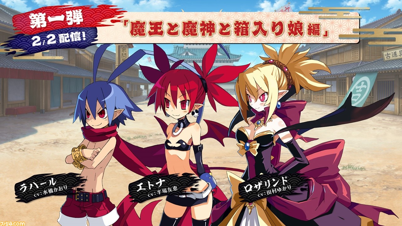 城花ダウンロードコンテンツの試みとして、3人セットというところが目玉になっています。これまでは、たとえば初代のラハール、エトナ、フロンだったり、『ディスガイア2』のアデル、ロザリー、アクターレといった具合に、シリーズごとの組み合わせが多かったのですが、今回はこれまであまりなかった組み合わせのキャラクターたちの会話を楽しめるようになっています。