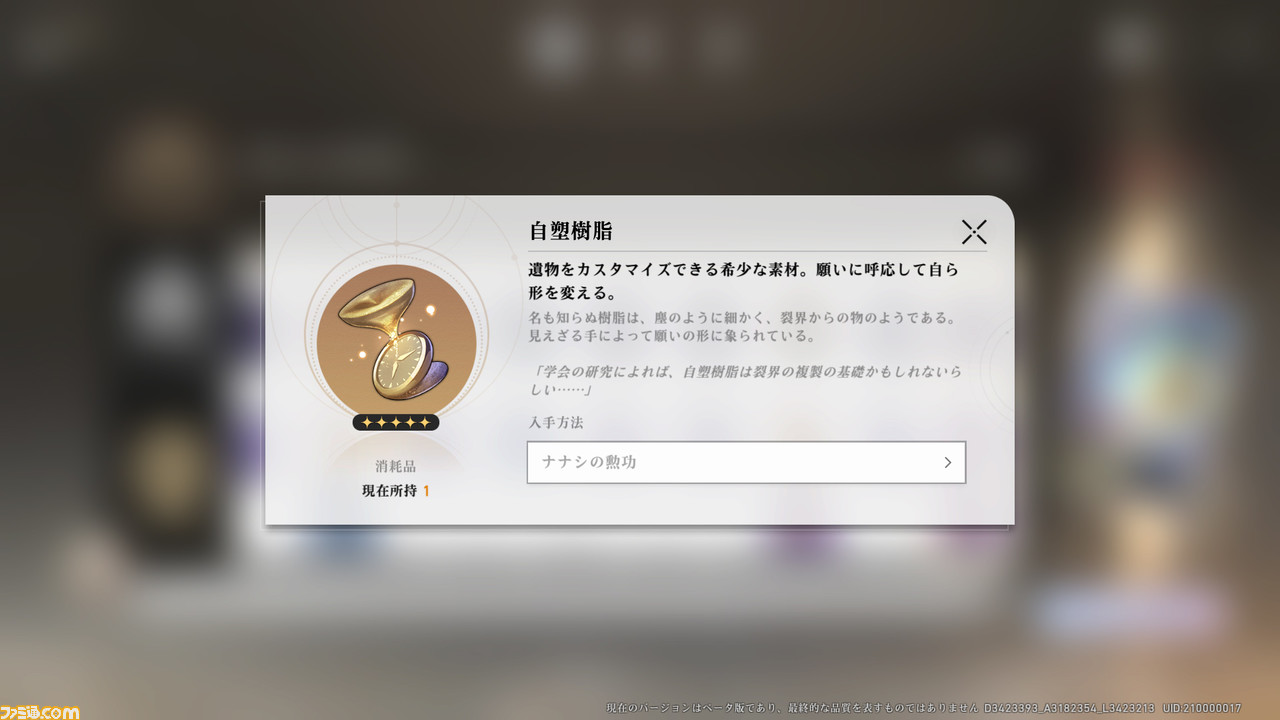 - 遺物/オーナメント:キャラクターに装備させる装飾品のようなもの。遺物は頭部、手部、胴体、脚部の4部位に装備でき、同じ種類のものを2つまたは4つ装備することでセット効果が発動。オーナメントは次元世球と連結縄と呼ばれる枠がひとつずつあり、同じ種類のものをふたつ装備すれば2セット効果が発動する。
