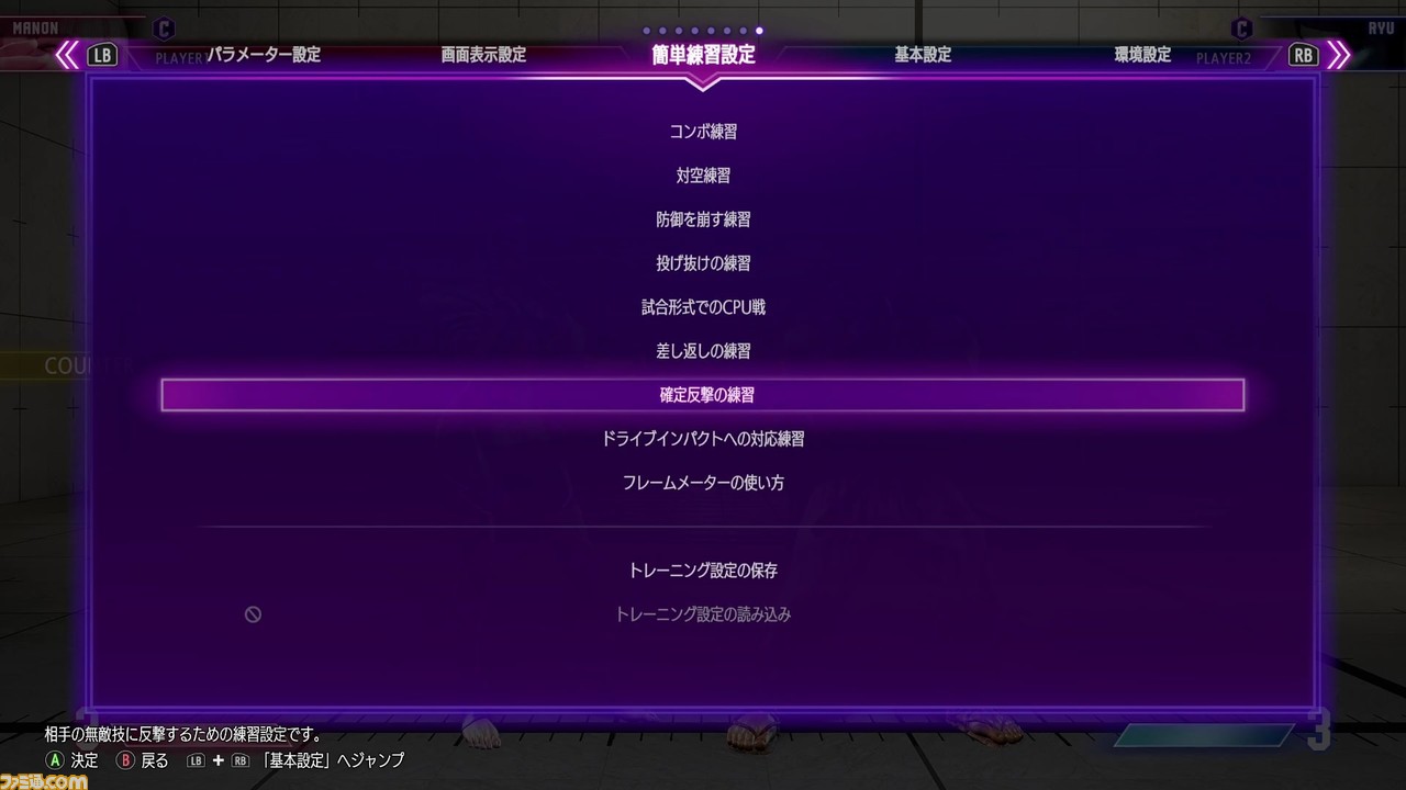 簡単練習設定では、ほかに相手の行動のあとに確定反撃を練習可能。相手に使わせる技はいろいろ設定できるので、対処に困った行動があれば、まずはこれらの設定を使って攻略法を探してみよう。