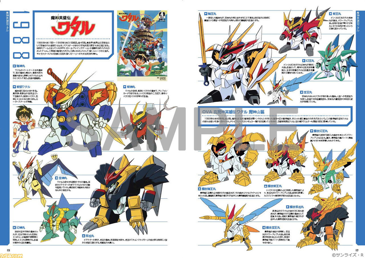 本書籍は、1977年~1989年に放送されたサンライズ製作アニメーションからロボット・メカが登場する23作品をピックアップしたオフィシャルブックです。本書の前半では作品概要と主要メカの設定画を掲載、後半では各ロボット・メカの詳細な線画設定を収録しており、総ページ数150ページ以上で構成されています。A4縦型冊子の表紙には、ダンバイン(『聖戦士ダンバイン』)、スコープドッグ(『装甲騎兵ボトムズ』)、龍神丸(『魔神英雄伝ワタル』)の3体がデザインされた、小曽根正美氏作画による新規描き下ろしイラストを使用しています。
