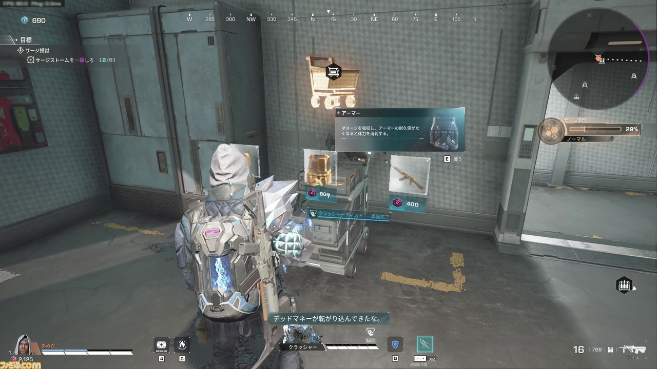 じっくり探索をしてアイテムを集めたいところだが、慣れていないうちは素早く探索し、サージ濃度が低いうちにクリアすることが求められる。