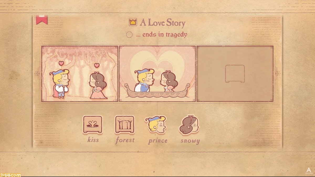 本作は、物語の流れを簡単に絵で説明する“ストーリーボード”の仕組みを利用した物語パズルゲーム。ステージごとに用意された話のお題に沿って、3~8マスのコマに登場人物と場面カードを配置し、お題の物語を作り出すユニークな内容になっている。
