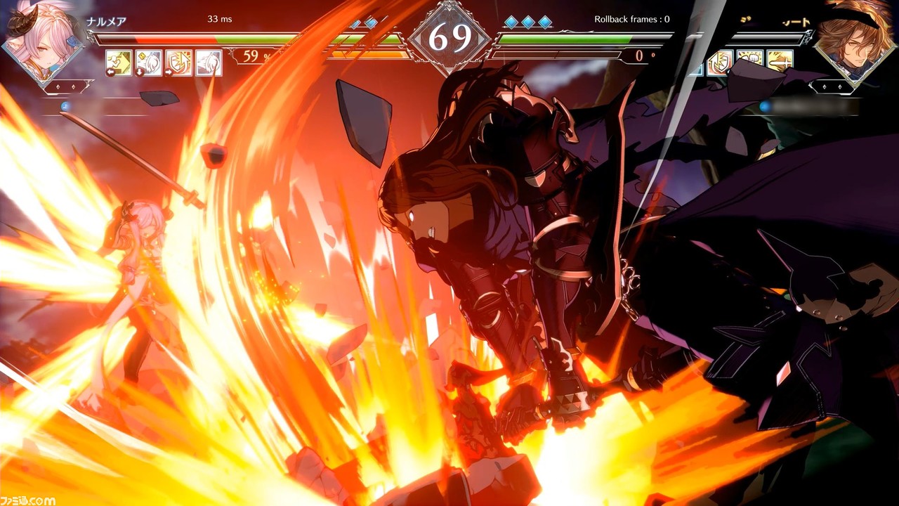 ネット対戦は『GBVSR』よりロールバックネットコードを採用。簡潔に言えば、ラグや遅延の少ない環境でネット対戦が楽しめるようになったということ。今回日本のプレイヤーのみならず、アジア圏や欧米圏(回線速度と、ユーザー名やプレイヤーコメントなどからの推測)ともマッチングしたが、アジア圏ならば問題なくスムーズに対戦可能。欧米圏のプレイヤーは、「ちょっと重たいかも」と感じるものの対戦できなくはないなと、ある程度は快適に対戦することができた。
