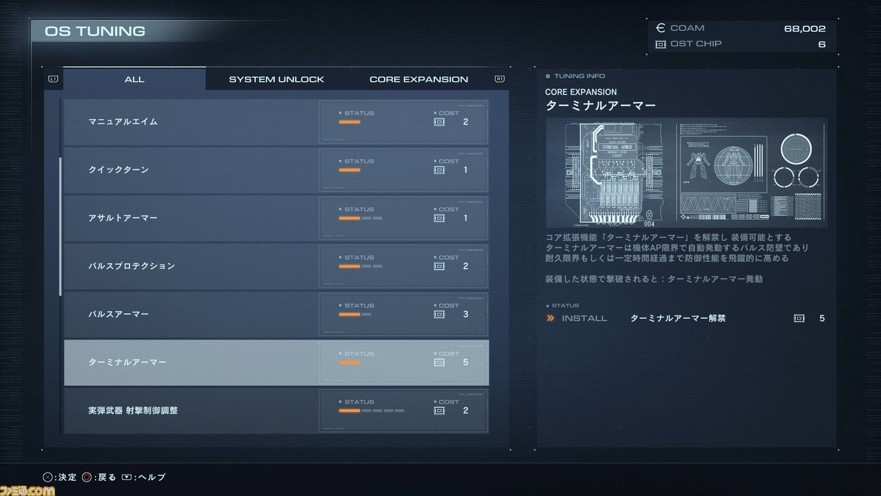 OSチューニングでは機体に追加機能を付与したり、“コア拡張機能”を獲得したりと、アセンブルとはまた異なる機体カスタマイズが楽しめる。また、ポイントはコームを支払えば何度でも振り直せる。