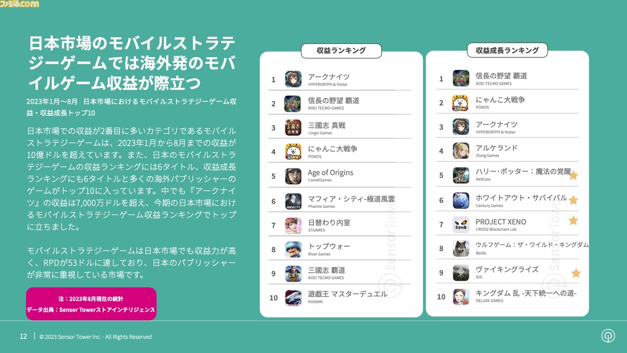 日本市場での収益が2番目に多いカテゴリであるモバイルストラテジー ゲームは、2023年1月から8月までの収益が10億ドルを超えています。モバイルストラテジーゲームの収益ランキング・収益成長ランキングでは、多くの海外パブリッシャーのゲームがトップ10に入っています。中でも『アークナイツ』の収益は7,000万ドルを超え、今期は日本のモバイルストラテジー ゲーム収益ランキングでトップに立ちました。