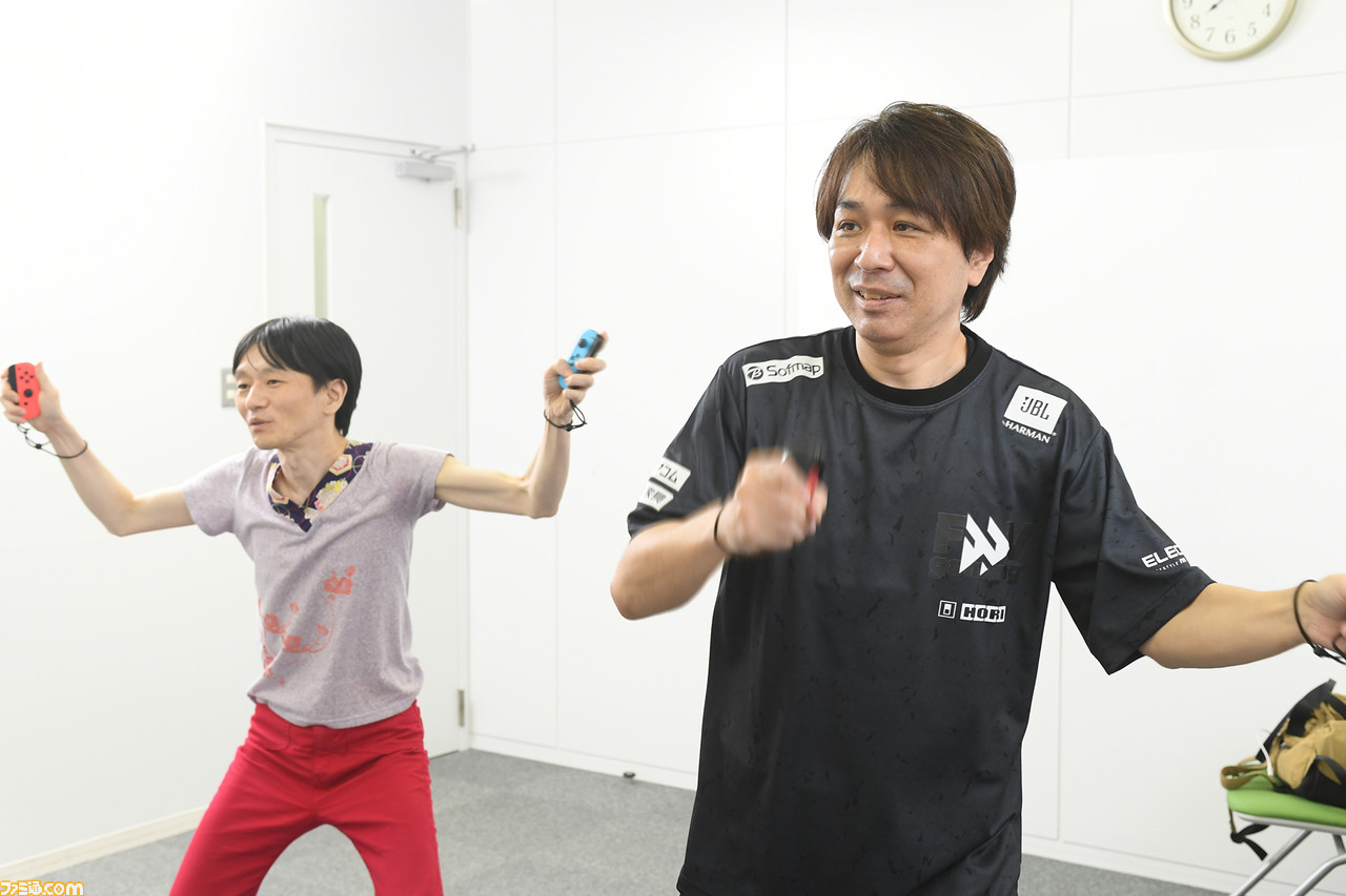 Joy-Conを振る。矢印に合わせてスライドさせる。指定されたポーズを取る。初見なのに迷うことなくついてくる豊島社長。「すごい! さすが!」と、褒めがナチュラルに口をついて出た。