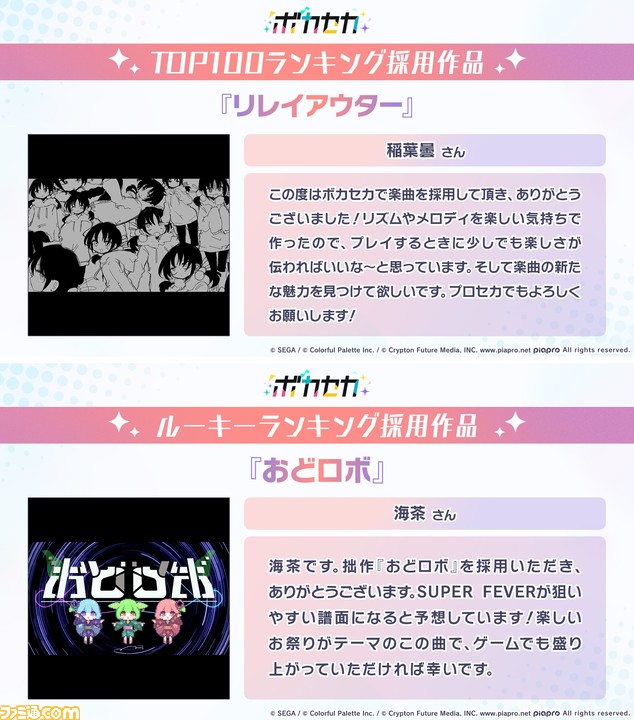 「ボカコレ 2023 夏」と『プロジェクトセカイ』のコラボ企画「ボカセカ」の採用作品として、「リレイアウター」(作詞・作曲:稲葉曇)と、「おどロボ」(作詞・作曲:海茶・多良レイト)をリズムゲーム楽曲に追加することが決定いたしました。本楽曲は、2024年2月頃の追加を予定しております。