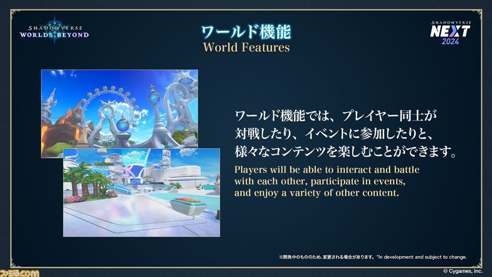 ゲームの企画・開発・運営事業を展開する株式会社Cygames(本社:東京都渋谷区、代表取締役社長:渡邊耕一)は、2023年12月10日(日)に『Shadowverse(以下、シャドウバース)』公式YouTubeチャンネルで公開した公式番組「Shadowverse NEXT 2024」において、自社で開発中の新作タイトル『Shadowverse: Worlds Beyond(以下、シャドウバース ワールズビヨンド)』を発表しました。本作のリリースは2024年夏を予定しています。