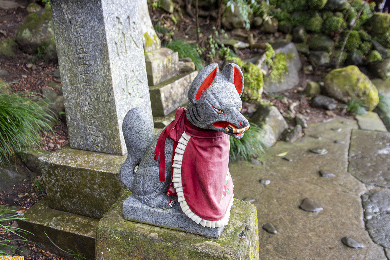 狐はお稲荷さんの使い。近隣の人から愛されているのか、前掛けでおめかしをしている子もたくさんいる。かわいい。