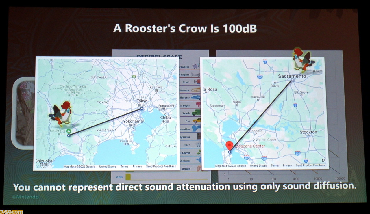 そもそも3D空間で音を鳴らすということは、音源が遠くに離れれば音が小さく聞こえたり、音源が画面の右側にあれば右のスピーカーから聞こえたり、洞窟に入れば音が響いたりといった音の変化をゲーム内で再現することである、と続けた。