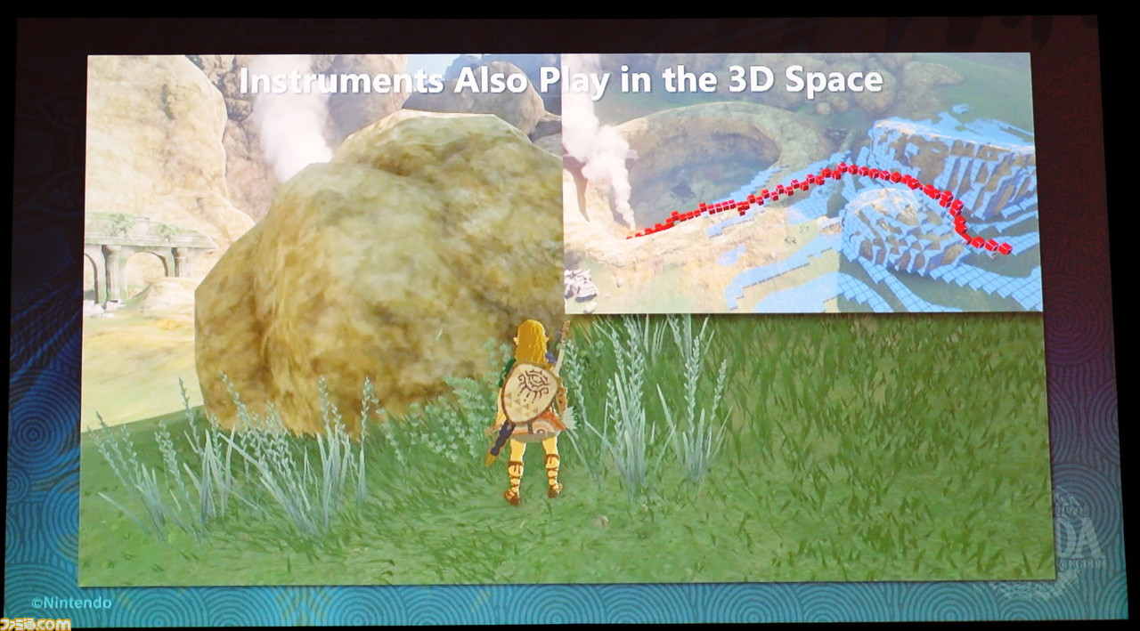 さらに本作では洞窟を初めとして非常に入り組んだ地形が増えており、ハイラル世界の音をより現実に近づけて表現するために、音の遮蔽や音の回り込みが重要になったとのこと。