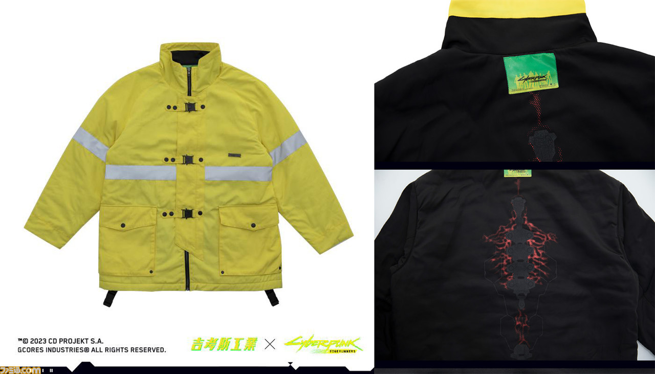 アニメ『サイバーパンク:エッジランナーズ』に登場するデイヴィッドのジャケット、ルーシーをテーマにしたスウェットシャツ、レベッカのスタジャンや、オープンワールドRPG『サイバーパンク2077』の景色に使われる特殊処理デザインのジャケット、ダウンベスト、リュックなど、全15種のアパレル商品が販売される。