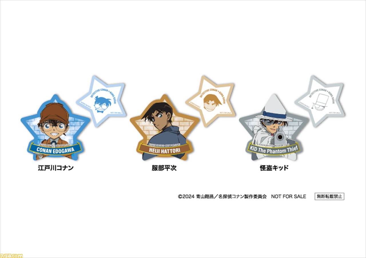 食べ終えたお皿を5枚入れると挑戦できる“ビッくらポン!”の景品には、お寿司とコナンたちが可愛らしく描かれたアクリルマスコット、コナンたちが怪盗キッドに扮装した“缶バッジ”、五稜星をイメージした星型の“マグネットシート2個セット”などが登場。また、2024年5月1日(水)からは缶バッジとマグネットシートに3種の新しいデザインも追加される。