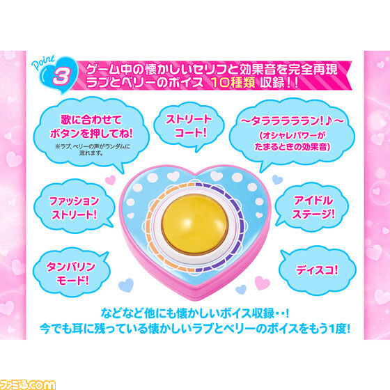 ハート型のボタン本体は、当時の筐体のボタン部を再現、ボタン周りも当時のデザインをベースにアレンジしたものとなっている。収録されている音声は、楽曲6曲やラブとベリーのボイス、当時の筐体ゲーム内で流れた効果音など。