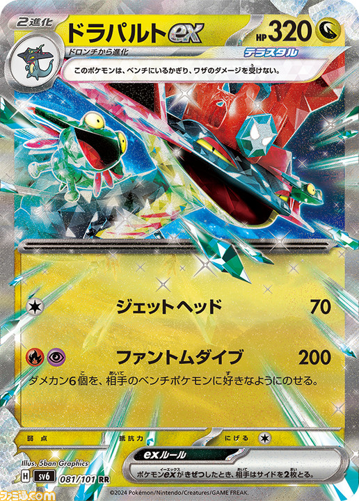 ドラパルトexが“テラスタル”のポケモンexとして登場。ワザ“ファントムダイブ”は、バトル場のポケモンにダメージをあたえつつ、ベンチポケモンにもダメカン6個を、好きなようにのせられる。HPの低いたねポケモンをたおしたり、後々バトル場に出てきそうなポケモンにダメカンをのせておくことができる。