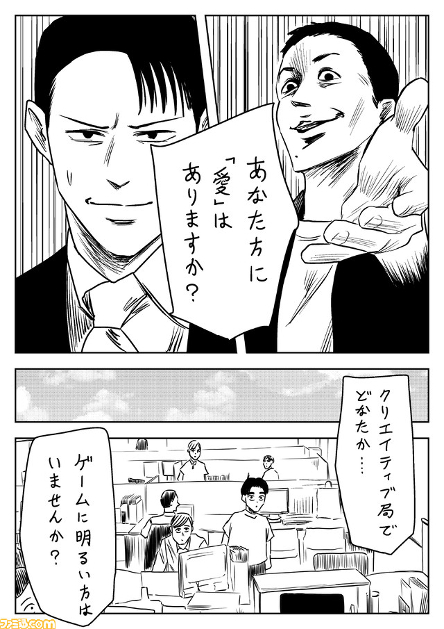 あるゲームソフトの宣伝会議が開かれた日。そこには光一が勤めている目黒広告社、発売メーカーの担当者たちが出席していた。そしてもうひとり、ディベロッパーであるサイバーコネクトツー代表・松山の姿が……。ゲーム業界を舞台にした『チェイサーゲーム』と広告業界を舞台にした『左ききのエレン』のコラボマンガをお楽しみください︕
