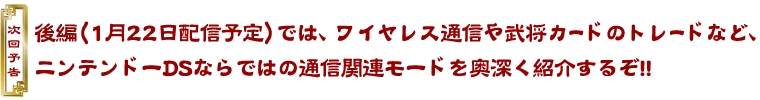 全国のアミューズメントスポットで好評稼動中の『三国志大戦』シリーズがニンテンドーDSで登場! 実際に武将カードを動かして戦うというアーケード版ならではの操作感覚を、DS版ならではの操作性で再現。DS版では本体を縦にしてプレイする。ミニマップつきの戦場画面が左のディスプレイに、武将カードを動かす盤面が右のタッチスクリーンにそれぞれ対応。カードをタッチペンで動かすと、ディスプレイ画面の武将が動く仕組みになっている。また、ゲーム内で入手した武将カードをワイヤレス通信でトレードしたり、すれちがい通信を利用した特殊な一騎討ちが楽しめたり、さらにニンテンドーWi-Fiコネクションを使って全国のプレイヤーと通信対戦できたりと、DSならではの、さまざまな要素が含まれているぞ。 |