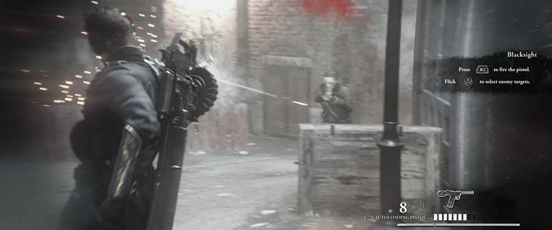 “オーダー”の面々は“ブラックウォーター”を飲んだことで、特殊能力“ブラックサイト”を使うことができる。これはL1ボタンを押すと一定の時間、早く動けるようになり、右スティックを入力すると順番に敵に照準が合っていくなど、敵を倒しやすい状況を作り出せる能力だ。また、ほかにも障害物などの陰に隠れるカバーシステムや、特別な操作で進行する格闘戦なども用意されている。