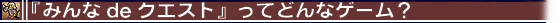 『みんなdeクエスト』は、WEBブラウザソフト上のキャラクターに指示を与えるだけで冒険が楽しめる、新しいタイプのネットワークRPGだ。ユーザーは公式サイトのトップページから自分専用IDでゲームのフィールドにログインし、我が道を選択。そのチョイスによってバトルやイベントが発生し、冒険の旅が進行していくが、その経過は毎日2回メールで届けられるシステムとなっている。メールで受け取った結果を受けて、さらにゲームを進めることなるのだ。