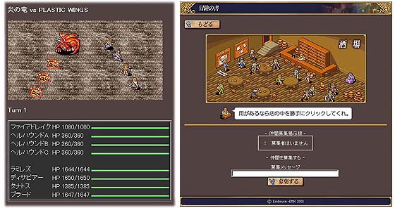 ▲パーティを組んでバトル(左)。街の酒場で、仲間を募集!!(右)。