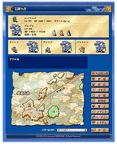 ゲームのフィールド内では、"商店"や"市場"などで道具を売買することができるほか、"酒場"の掲示板やメールを使って他のプレイヤーとコミュニケーションも可能だ。また他のプレイヤーとバトルをして腕試しができる"闘技場"も用意されている。